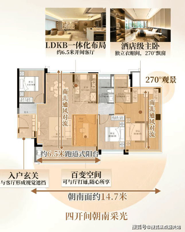 对于改善型需求,建面约106㎡与117㎡的户型则提供了更为奢享的空间体验。106㎡户型拥有约14.7米的南向面宽,餐客厅与主卧均实现了南北通透,清风时时流连,空气流通极佳。独立的入户玄关设计,优化了归家动线,避免了开门即见户内的尴尬,营造出尊崇的仪式感。而117㎡户型更是采用了专梯专户的洋房设计,五开间朝南,约17.5米的巨幅面宽,让阳光与风景成为家中的常客。LDKB式的通透布局,配合超高的得房率,让居住者能够享受到媲美大平层的奢华感受。特别是其约50㎡的LDKG无边界巨厅,连接着约6.6米长的南向阳台,无论是家庭聚会还是朋友宴请,都能从容应对,尽显主人风范。