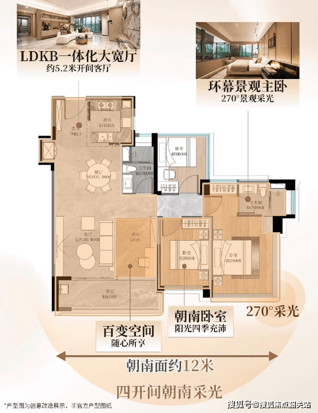 这种“V字型”布局带来的首要优势是采光面的极大拓展。以项目中备受关注的建面约117㎡户型为例,其南向采光面宽达到了惊人的约17.5米,形成了五开间朝南的宏伟格局。这意味着,不仅仅是客厅和主卧,连次卧甚至书房都能享受到充沛的阳光沐浴。在清晨,第一缕阳光可以毫无阻碍地洒满整个居室;在午后,室内依然明亮通透,无需长时间开启人工照明。这种全卧室朝南的设计,不仅提升了居住的舒适度,更符合中医养生中“阳气充足”的理念,为居住者营造出健康向上的生活氛围。