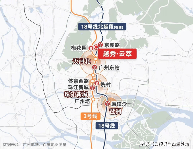 在轨道交通方面,越秀·云萃堪称“双地铁”项目的典范。项目家门口即是规划中的18号线京溪路站,这条被誉为“大湾区最快地铁”的线路,一旦建成通车,将实现从京溪路到珠江新城冼村站、琶洲磨碟沙站的快速直达,全程无需换乘。18号线公里,届时从项目出发,仅需两站即可抵达珠江新城,极大地缩短了时空距离。这对于依赖地铁通勤的上班族来说,无疑是一个巨大的利好消息。除了18号线号线号线作为广州最繁忙的地铁线路之一,连接了天河体育中心、珠江新城、广州塔等多个重要节点,进一步丰富了居民的出行选择。双线加持,使得越秀·云萃的交通便利性在同板块项目中脱颖而出,成为名副其实的“轨道上的家”。