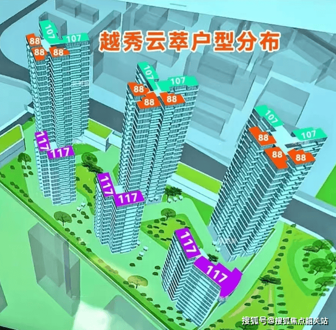 越秀·云萃在建筑形态上的创新,首先体现在其独创的“V字型”板楼设计上,这一设计彻底打破了市面上清一色“一字型”板楼的固有格局。在传统的高层住宅设计中,受限于地块形状和容积率要求,许多楼盘不得不采用进深较大、面宽相对狭窄的布局,导致部分房间采光不足或通风不畅,甚至出现“黑房间”现象。而越秀·云萃通过精妙的规划,将楼体设计为舒展的“V”字形,使得整体建筑的开间显著大于进深,真正实现了“大面宽、短进深”的理想居住形态。